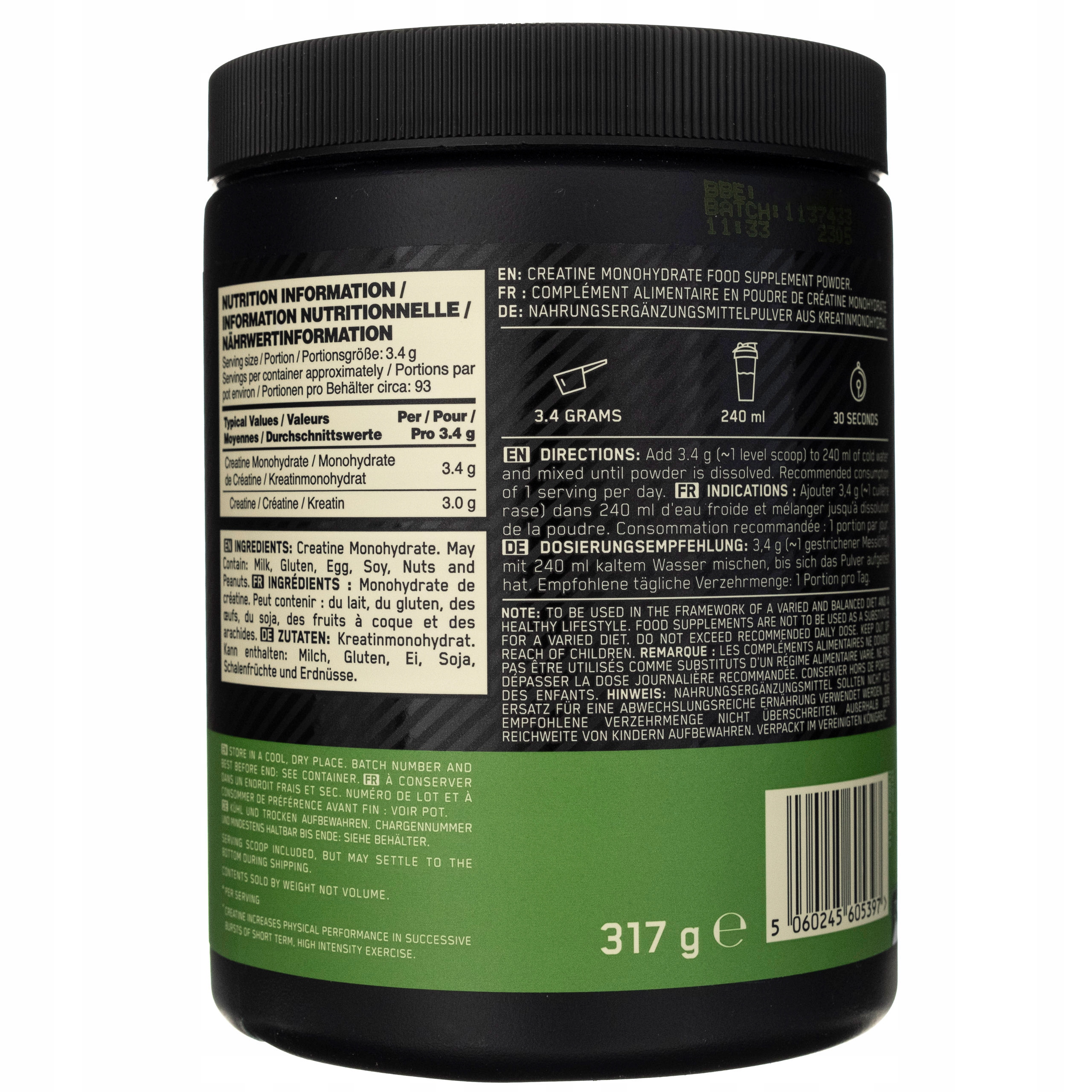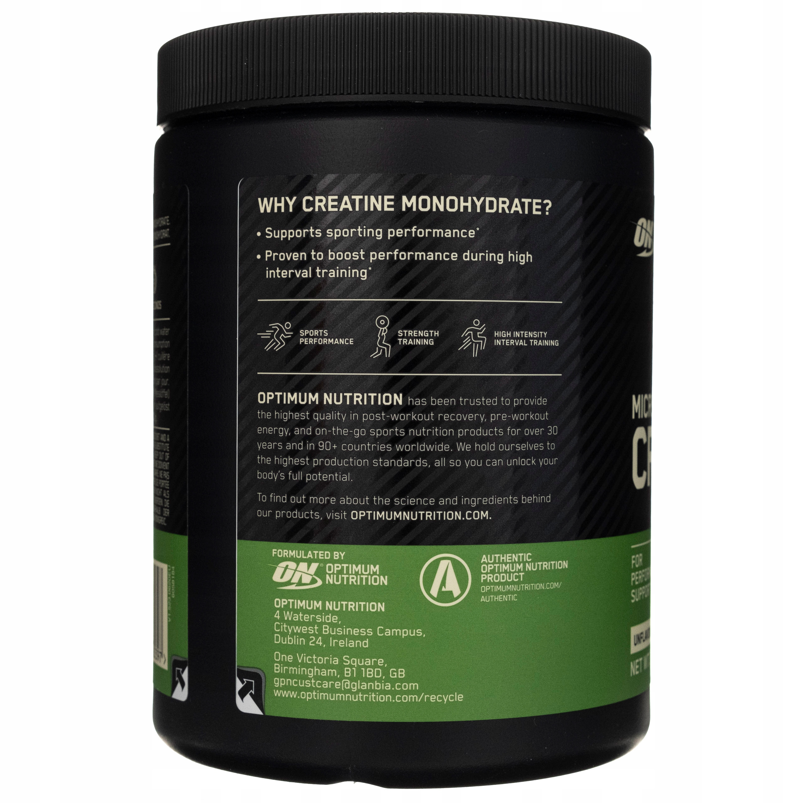 Creatine Powder: 100% pure, micronized creatine monohydrate that supports muscle mass and strength development and increases performance